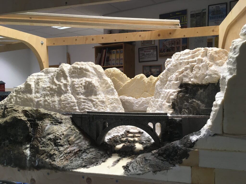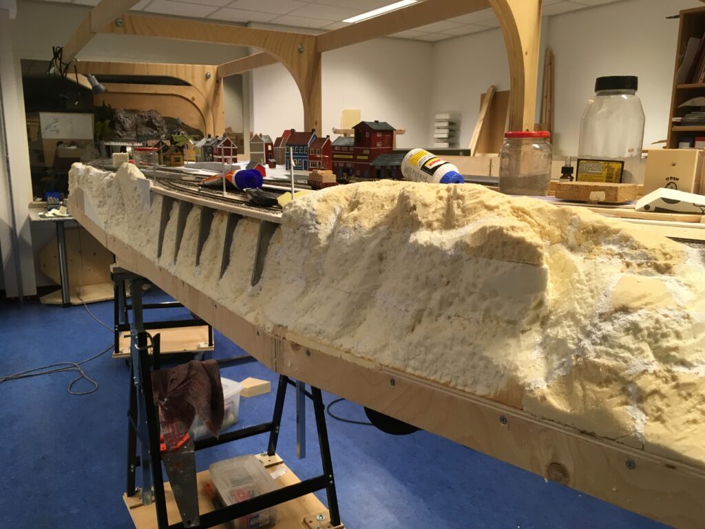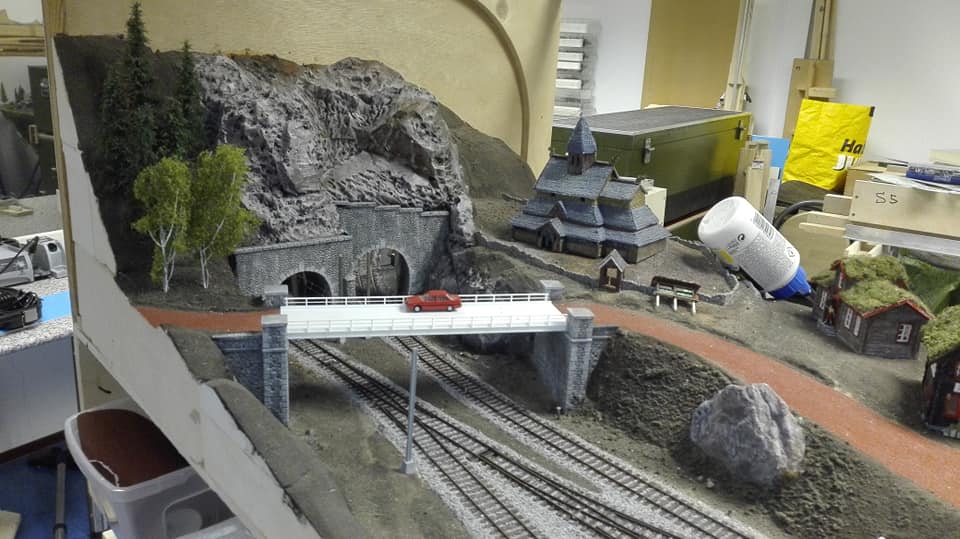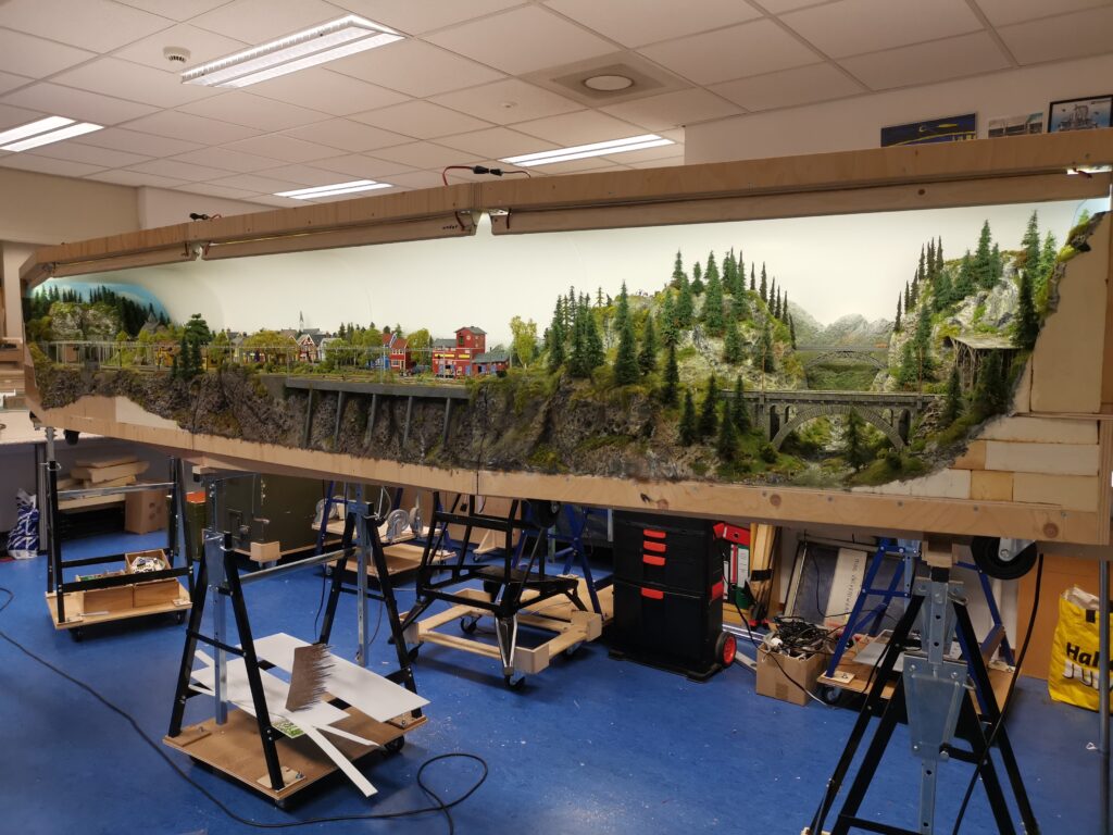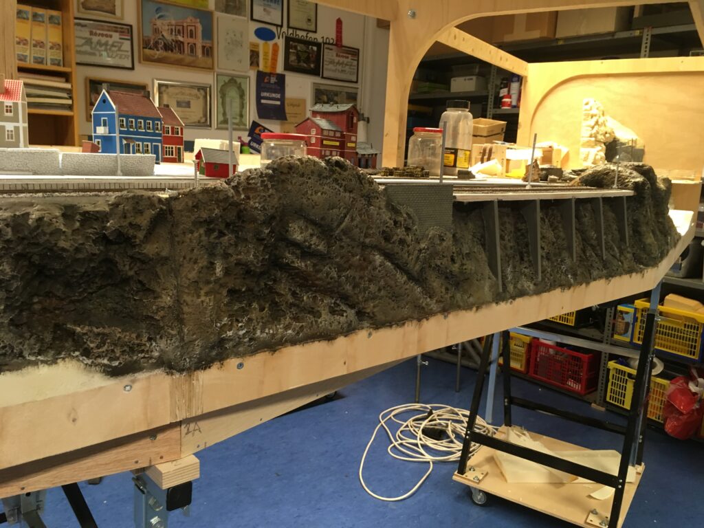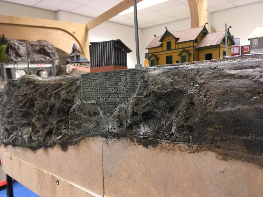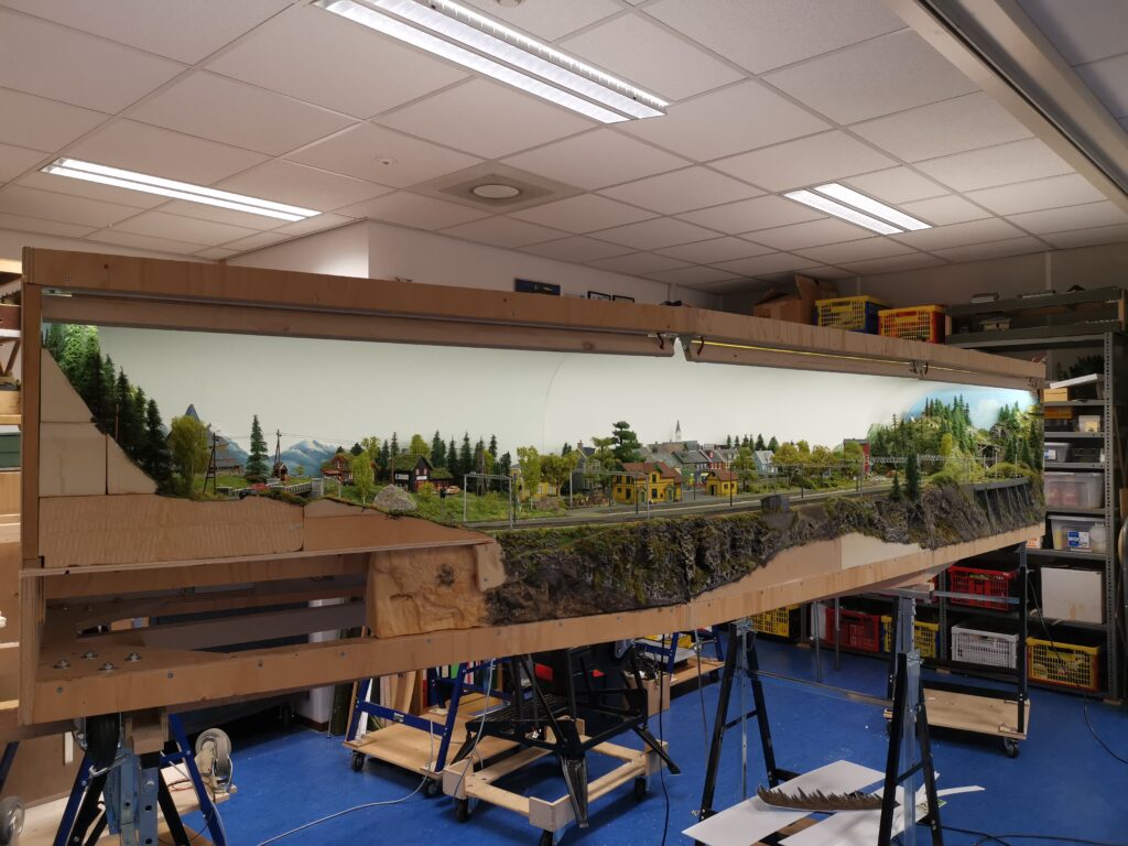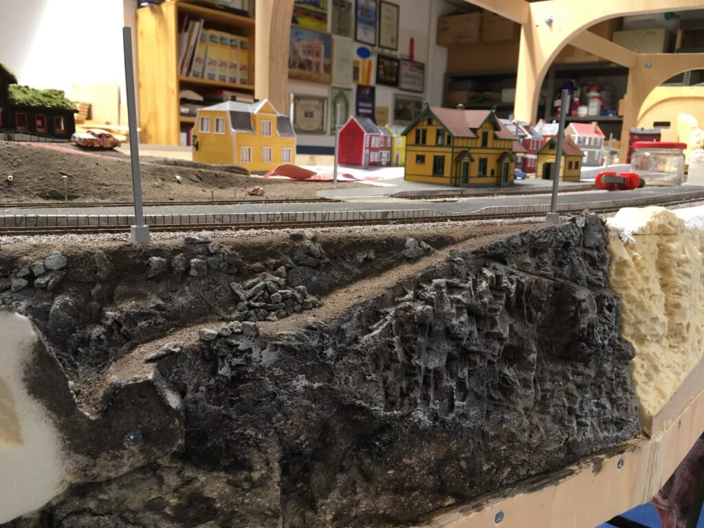 Voorjaar 2019. De rotsen krijgen al vorm en hier en daar ook al wat verf. Het station en al enkele huizen zijn klaar, voorlopig staan ze nog niet vast. Ook de rotspartij aan de voorkant krijgt al vorm en wat verf.