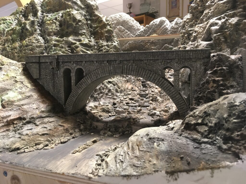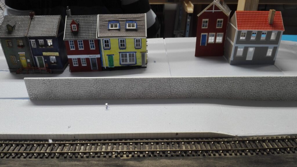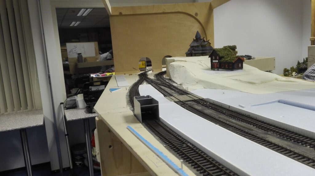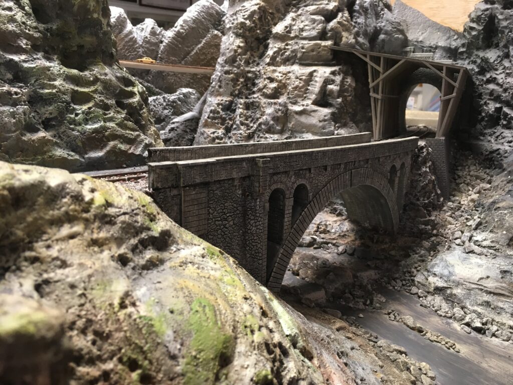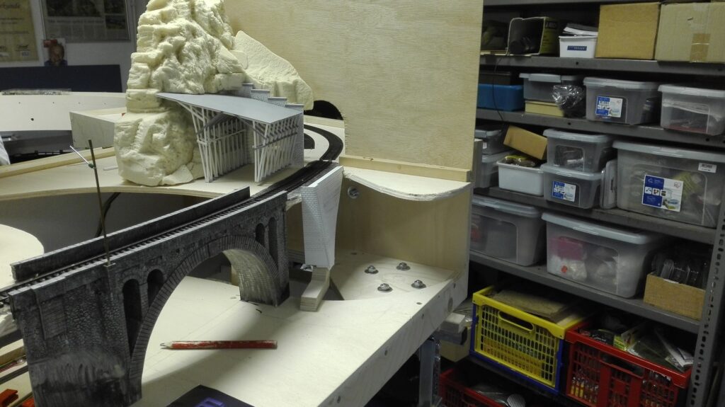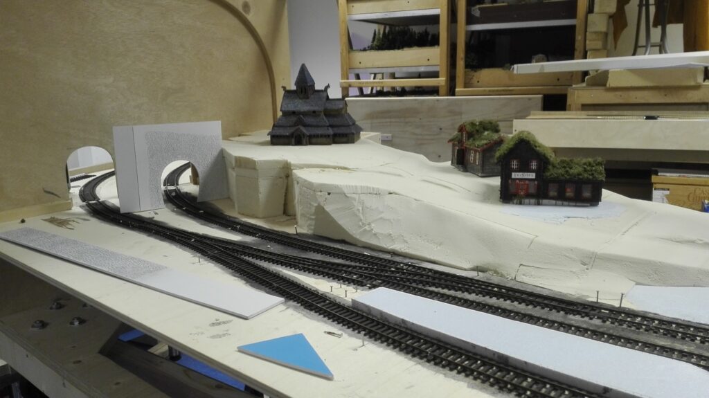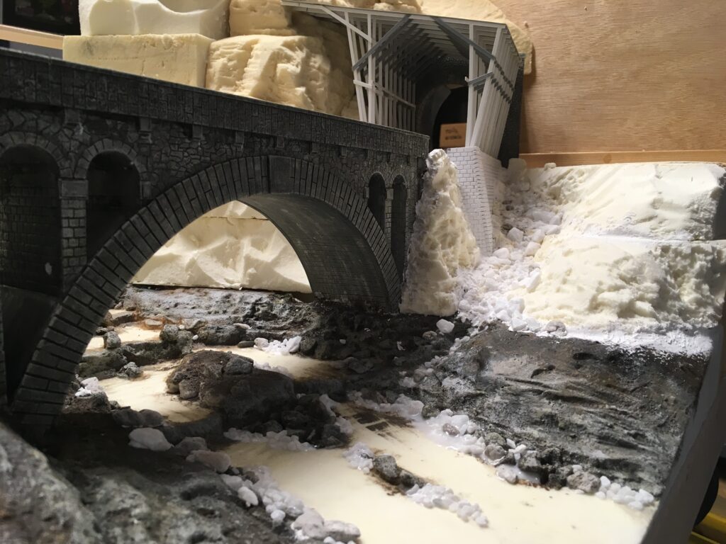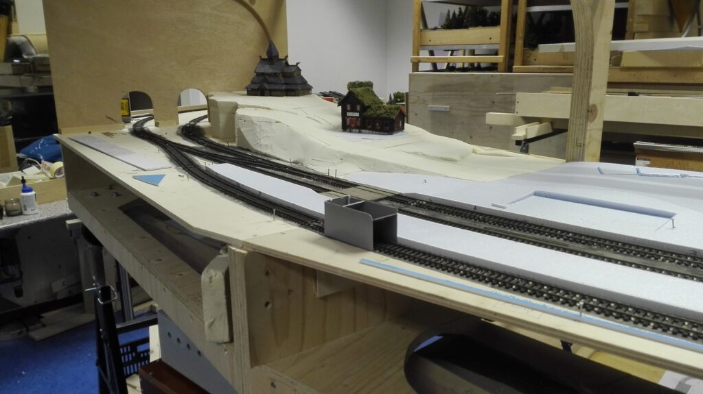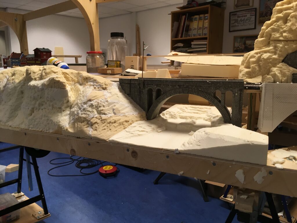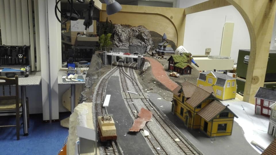 Voorjaar 2019. De rotsen krijgen al vorm en hier en daar ook al wat verf. Het station en al enkele huizen zijn klaar, voorlopig staan ze nog niet vast. Ook de rotspartij aan de voorkant krijgt al vorm en wat verf.