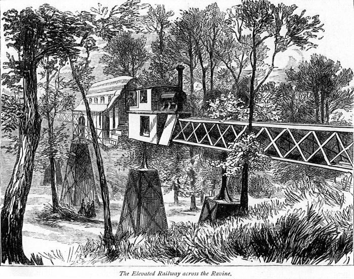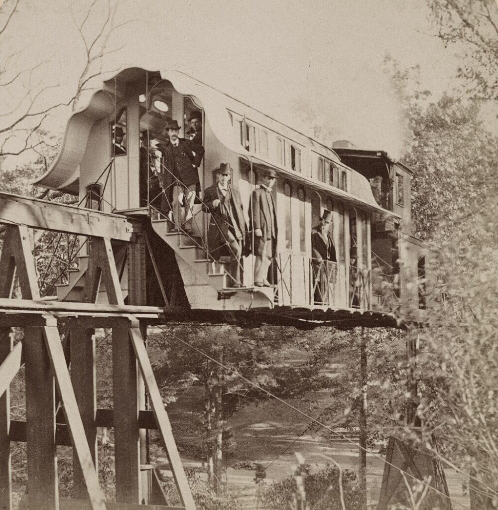 “Het was een warme zomerdag in Philadelphia en ik was een van de vele bezoekers die naar de Centennial International Exhibition in Fairmount Park waren gekomen om de wonderen van de moderne technologie te bekijken. Ik had al veel gezien, zoals de telefoon, de typemachine, de naaimachine, de fonograaf en de laatste ontwikkelingen in de gemechaniseerde landbouw en in militair materieel, maar toch er was één attractie die me het meest intrigeerde, namelijk de Centennial Monorail.