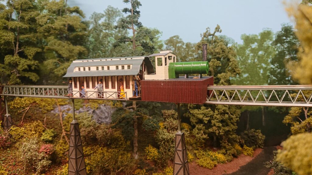 De bovenstaande foto en een tekening van deze monorail hebben mij geïnspireerd tot het maken van een diorama, waarbij het treintje heen en weer rijdt over een beekdal, overeenkomstig het echte voorbeeld.